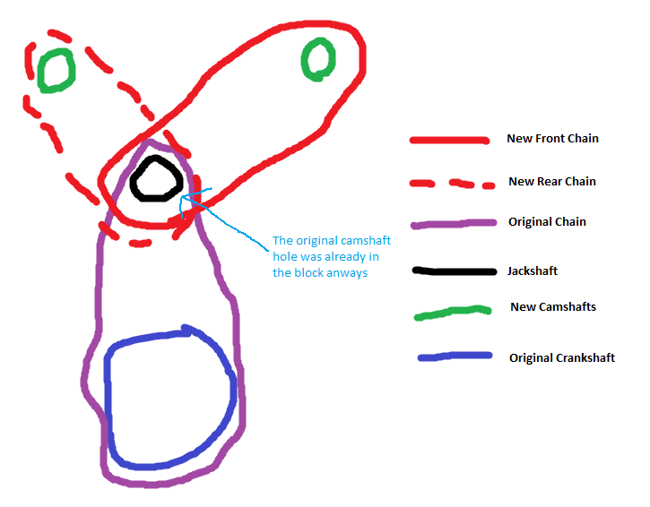 The jackshaft is in the middle of the v;